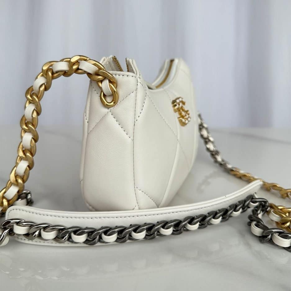 Shiny lambskin, gold, silver and ruthenium-plated metal
