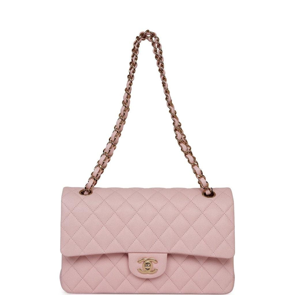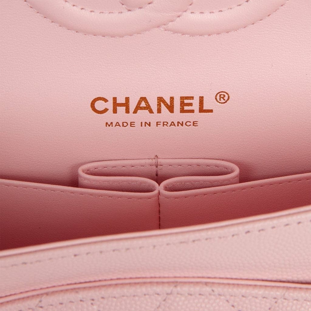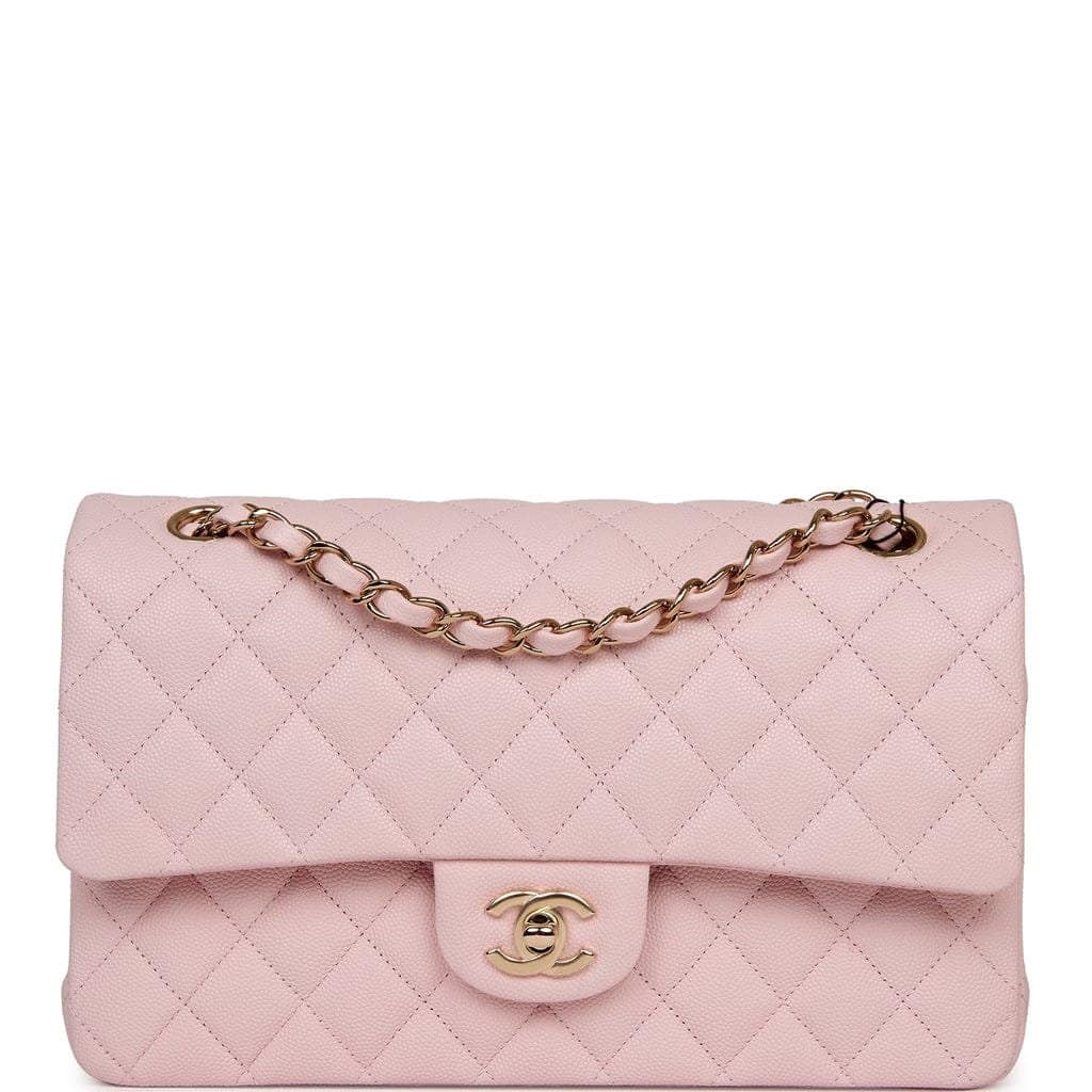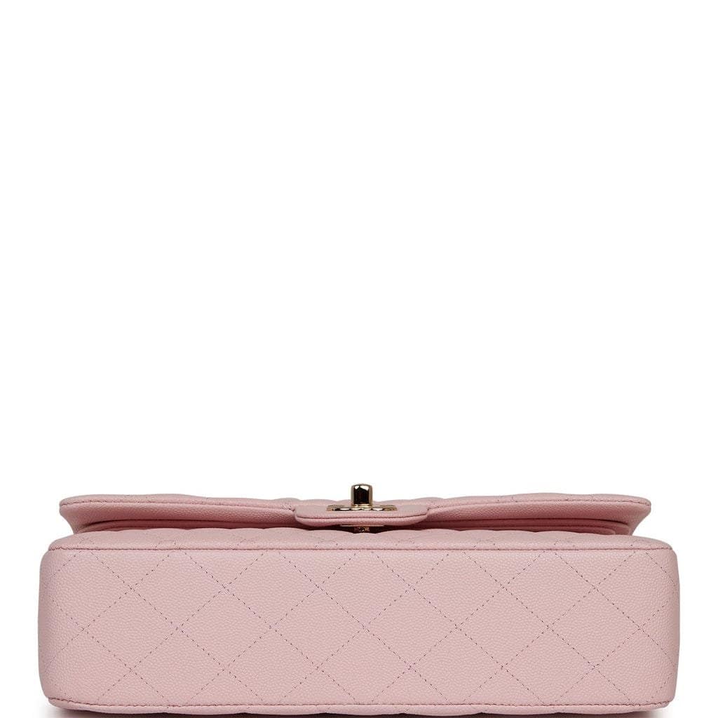 This Medium Classic Double Flap bag is in light pink caviar leather with light gold tone hardware and features a front flap with signature CC turnlock closure, half moon back pocket, and adjustable interwoven light gold tone chain link and light pink leather shoulder strap.